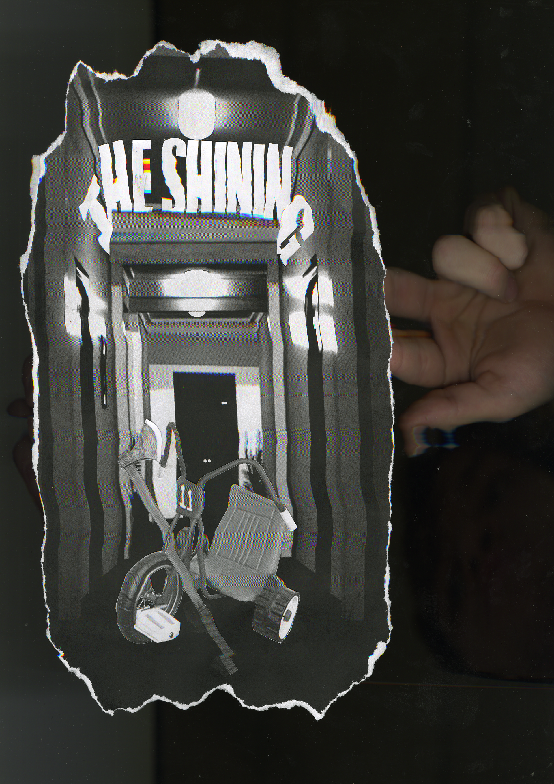 I used the same sliding and pulling techniques during the scan to create tv static glitch lines. I also shined a light through the paper at the same time to brighting up certain areas and give a sort of real lighting effect like you see in the hallway lights on the left. When editing in photoshop after, I changed the levels of red and blue when turning it black and white which gave the lines across the design. After this I added some final details in Photoshop, then created the book designs and mock ups in Illustrator.
